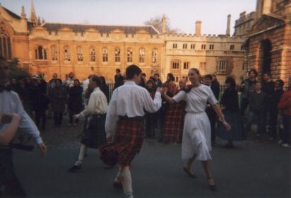 + + +From the 18th to the 21st March 2000, a team comprising Jenny Bletso, Gabrielle Higgins, Eszter Szegvari, Rachel Pusey, Bevan Marchand, Duncan Sheehan and Adrian Gillott represented the society at a Folk Festival in Portugal. Music was provided by a CD courtesy of Rupert Wilmouth, and coaching was variously provided by Alice Stainer, Emily Connell, Helen ap-Rhisiart, Jenny's mother, and the members of the team.