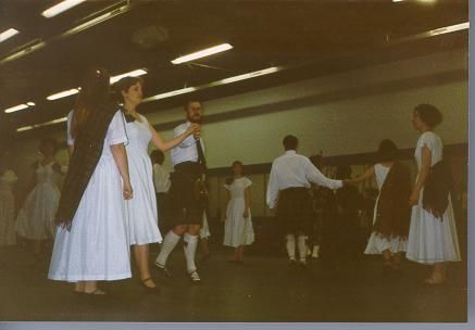 + +We finally got to the hall to see that we were in 6th place. (this was, of course, later changed). Highlights of the evening were the guitar orchestra (which we have a tape of) and the Spanish Flamenco dancers. +Our performance was somewhat interesting, and had to be rewritten mid flow. The first set went without mishap, then things started going. Duncan's sporran fell off during the Fling, which was very off-putting (Bevan's tassels thankfully were better behaved than on previous occasions). The suppressed squeals and giggles from the audience as the rocking step started were apparently audible backstage. Then, just after the chord to start the Six-some, one of the sound technicians took a unilateral decision that we needed some applause, and switched off the volume. Fortunately he took this course and not switching off the CD, as that really would have terminated our performance. When he switched it on again, some careful counting was required to work out where we were, but we got back on track. The audience particularly appreciated the leaping, spinning and whooping that happened in the 6-some. This worked OK, and the Shepherd's crook went without a hitch. Bevan then disappeared off to deal with serious dehydration, leaving the others to do the 2nd set of Country dances, and reappearing at the end. After our last circle in Mairi's wedding, we formed a straight line, bowed and then rendered Auld Lang Syne at a very high pitch with strained voices, but the audience seemed to love it. The curtain came down on us at that point, which was fortunate, as we had no prearranged way of leaving the stage.